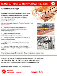 «Русская Трапеза» возобновляет серию ежегодных семинаров для директоров и главных инженеров кондитерских, хлебопекарных и пищевых предприятий прочей направленности. Первый двухдневный семинар пройдет...Компания: РУССКАЯ ТРАПЕЗА, ООО